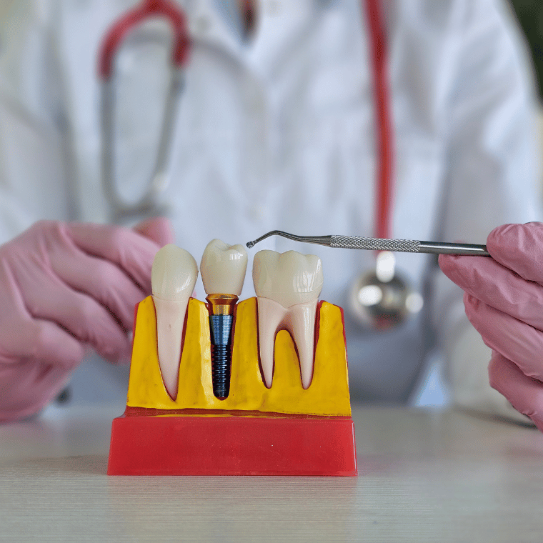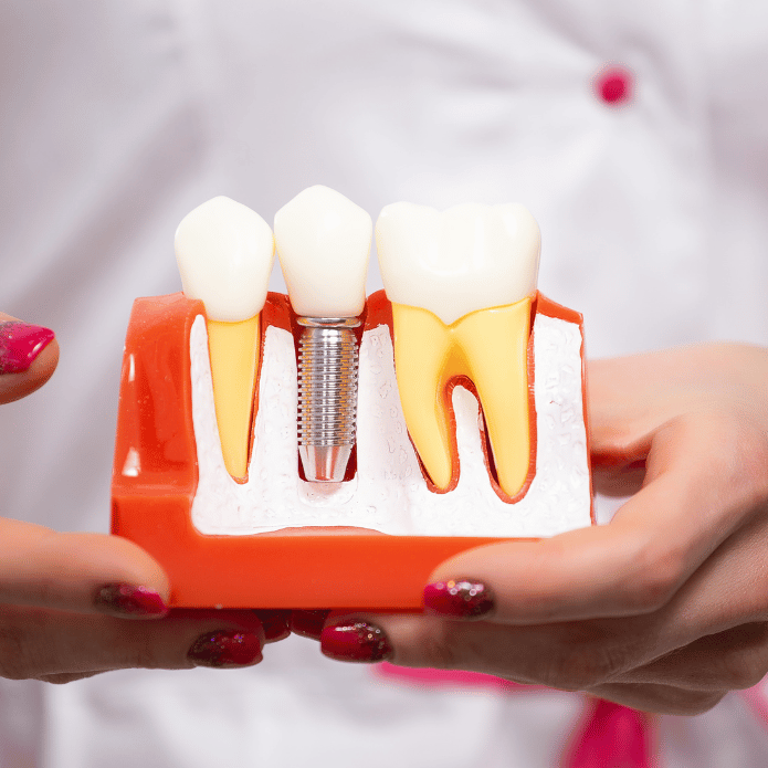 A dental implant is a small, biocompatible titanium post that is surgically placed into the jawbone to serve as an artificial tooth root. Once the implant fuses with the bone – a process called osseointegration – a custom-made crown is fixed on top, giving you a tooth that looks, feels, and functions just like a natural one.